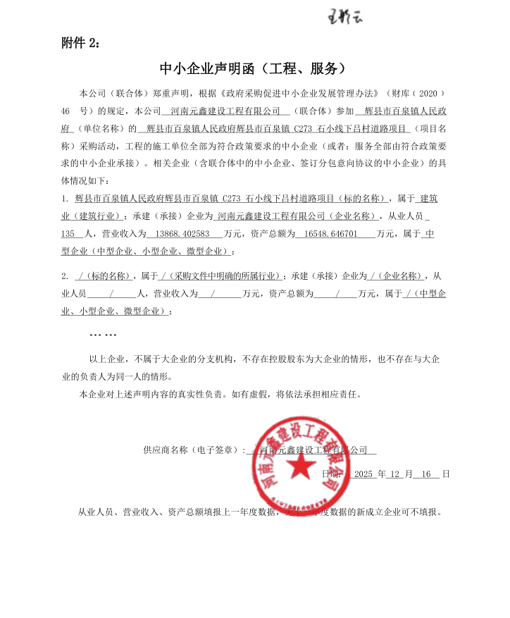 辉县市百泉镇人民政府辉县市百泉镇C273石小线下吕村道路项目-成交公告