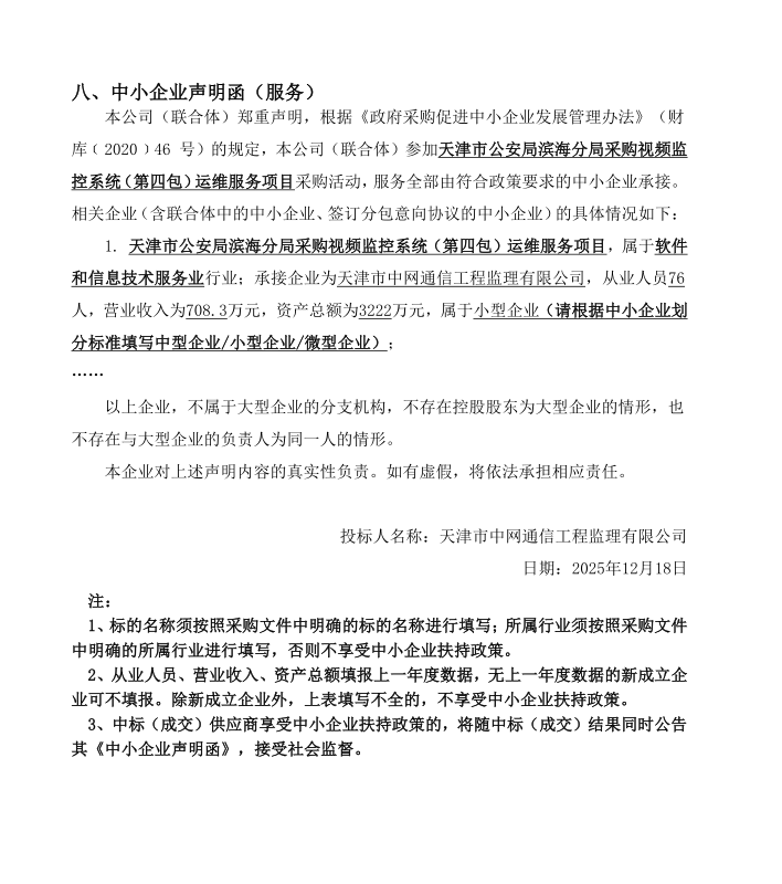 天津市公安局滨海分局采购视频监控系统(第四包)运维服务项目(项目编号:TJBH-2025-D-0191)中标结果公告